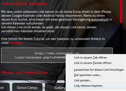 2. Klick auf 'Mein Profil', kopieren des unter Links in die Zwischenablage. Dies kann einerseits durch Rechts-Klick auf den Link und Klick auf 'Link-Adresse kopieren' (Firefox, siehe Screenshot), 'Verknüpfung kopieren' (Internet Explorer) oder 'Adresse des Links kopieren' (Chrome) erfolgen